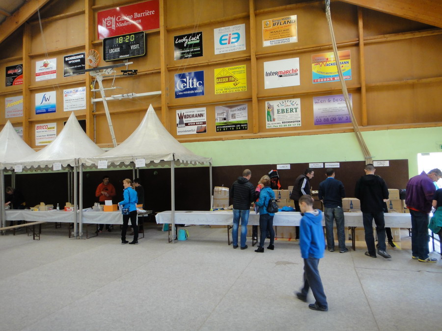 Am Donnerstag und Freitag nutzen wir unsere Zeit für Ausflüge ins umliegende Gelände von Niederbronn-les-Baines (198 m). Stellenweise treffen wir so auf Streckenabschnitte der Wochenend-Wettkämpfe, welche schon mit Sägespänen abgegrenzt sind. Am Freitagabend erfolgt im Sportzentrum die Ausgabe der Startunterlagen. Das dafür im Original benötigte ärztliche Attest landet zu unserem Erstaunen auf einem großen Stoß weiterer Zettel, ohne irgendwie geprüft zu werden. Da hätte es dann sicherlich auch eine formlose Einwilligung vom Lebenspartner oder vom Laufgruppenältesten getan, um diese bürokratische Hürde zu nehmen. Für beide Veranstaltungen gibt es je eine Startnummer, also keine "besonderen Erkennungszeichen" für die Doppelstarter in Form einer eigenen Nummer. Dazu wird pro Lauf eine Flasche regionales Bier und ein Teilnehmerhemd für die jeweilige Sonntagsveranstaltung (in blau für den MAC IV oder in rosa für den Grand défi des Vosges) gereicht.