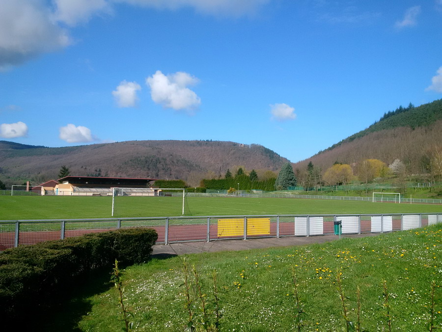 Nach einer kleinen Stärkung begeben wir uns auf die letzten acht Kilometer, die sich fast nur noch hinab ins Tal ziehen - kleine Gegenanstiege ausgenommen. Die Wege über den Col du Pottaschkopf (482 m) und den Col Borneberg (461 m) lassen sich richtig gut laufen. Wir machen daher noch einige Plätze im Klassement gut und biegen wenig später auf uns bekanntes Terrain. Nach dem Aussichtspunkt Les trois chenes (325 m), den drei Eichen, überholen wir sogar noch zwei Frauen. Die jüngere der beiden wähnen wir in der "L'Integrale"-Wertung, was sich nach unserer Zielankunft jedoch als falsch heraus stellen wird. Auf einmal können wir noch einen Zahn zulegen und kommen so zwangsläufig ins Gespräch über die wichtigen Dinge: Natürlich hat Ute vor dem heutigen Start das Teilnehmerfeld nach Konkurrentinnen vom Vortag abgesucht und sie ist dabei auch fündig geworden. Da aber keine Ergebnisliste vom Défi des Seigneurs aushing oder im Internet abrufbereit war, blieb allerdings auch viel Spekulation. Dann erzählt mir Ute von dem Radfahrer, den wir heute dreimal an der Strecke sitzend trafen, der ihr zurief (während ich in Jaegerthal etwas abseits fotografierte), sie wäre "premiere feminin L'Integrale" - also "erste Frau der L'Integrale-Wertung". Und Ute erzählt mir das auch nur, weil sie es nicht richtig verstanden hat und ihre Vermutung jetzt (rund 45 Kilometer später) bestätigt haben will. Sicherlich handelte es sich bei dem Streckenposten um einen Offiziellen, der die Startnummern der jeweiligen Erstplazierten in petto hatte, denn ein System war/ist dabei nicht erkennbar. So haben wir genügend Gesprächsstoff bis ins Ziel, welches heute zwischen Sporthalle und Fußballstadion liegt. Die letzten hundert Meter laufen wir wieder Hand in Hand zum Zielbogen und stoppen nach 7:31 Stunden unsere Uhren.