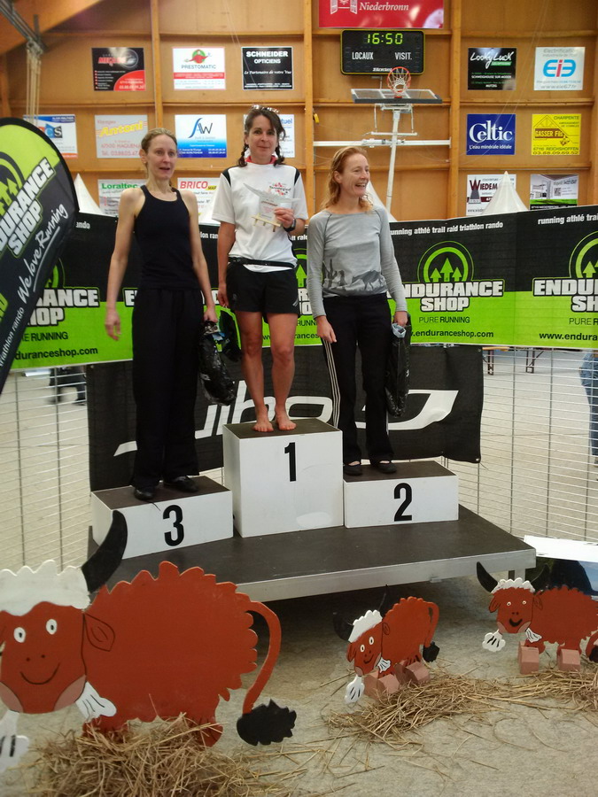 Auf der angrenzenden Wiese machen wir es uns nun im Sonnenschein bequem. Beim Verzehr von zwei Bier und zwei "Rotwürsten" warten wir gleich vor Ort auf die Siegerehrung. Und da wird "Üt Erfür" als "Vainqueur feminin L'Integrale" nach vorn gerufen! Ihr dritter Frauensieg im Ausland. Nachdem sie im Vorjahr den 48-Stundenlauf von Gols in Österreich klar gewonnen hat und 2013 als einzige Frau den schweren Trail Ticino (130 km) in der Schweiz überstand, ist nun auch ein Sieg in Frankreich zu verzeichnen.