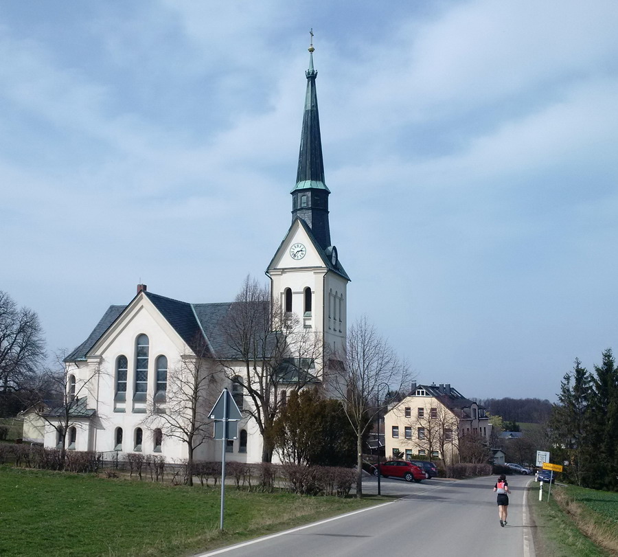 Mit sechseinhalb Minuten Lauftempo ist die Geschwindigkeitsvorgabe unseres Trainingsplanes nicht allzu ambitioniert. Daher bieten sich ein paar Steigungen in der Streckenführung wunderbar an, um uns in unserem Tatendrang auszubremsen. Mit vorgeschriebenen 70% Herzfrequenz ist eine körperliche Belastung trotz allem (fast) tabu. Deshalb nehmen wir auch den "sanften" Einstieg in das vordere Erzgebirge, d.h. nach dem Zwönitztalweg folgt in Erfenschlag nicht der Direktanstieg am Gutsberghang, sondern die "moderate" Straßenführung. Über die Pappel, Berbisdorf und Eibenberg gelangen wir wieder ins Zwönitztal bei Kemtau. Es folgt rund ein Kilometer entlang der Bundesstraße, ehe es in Burkhardtsdorf wieder bergauf geht. Auf dem Pfad am Waldesrand werden dabei schon mal die Hautpartien der Waden von den noch niedrigen Brombeerstrauchstengeln auf ihre Reißfestigkeit geprüft.